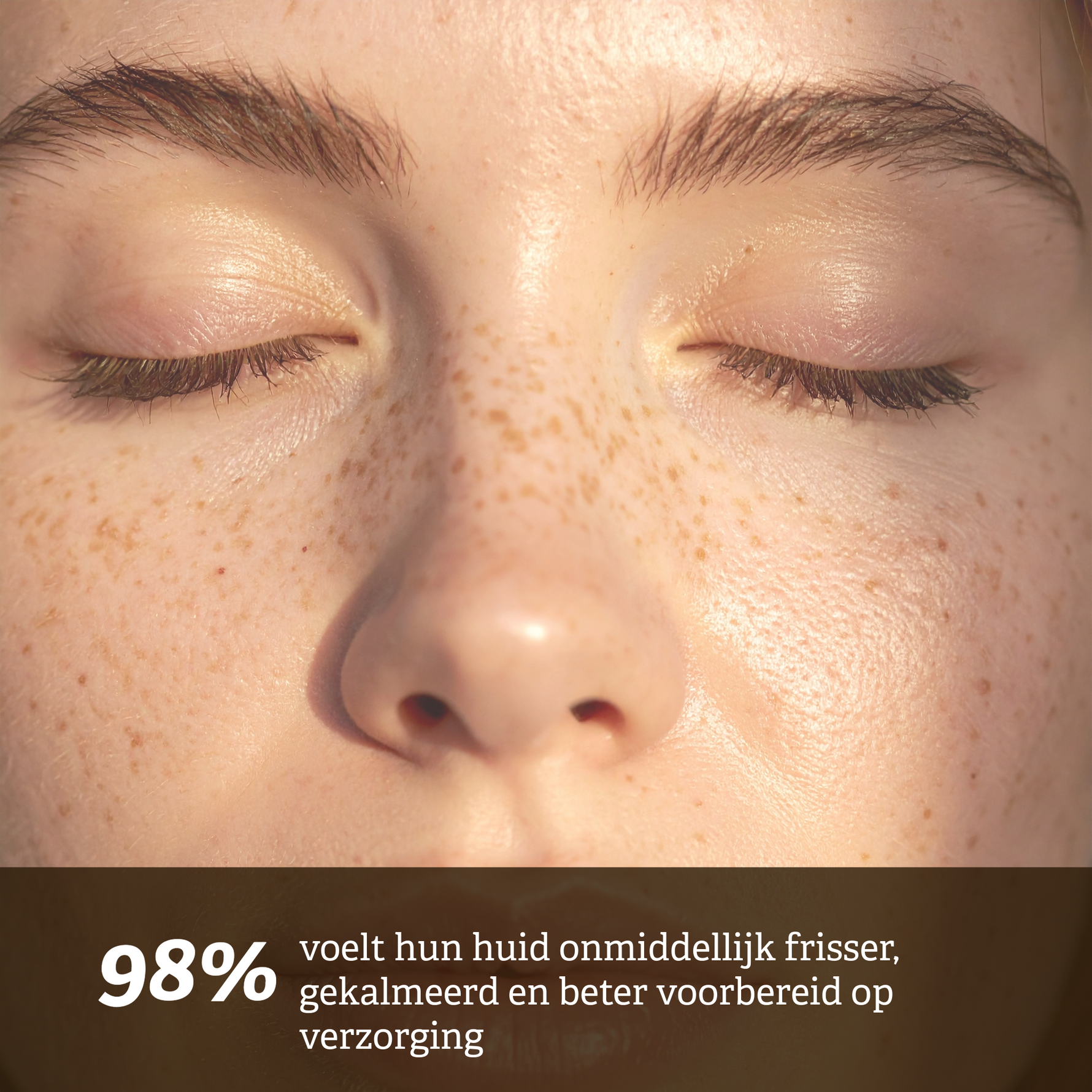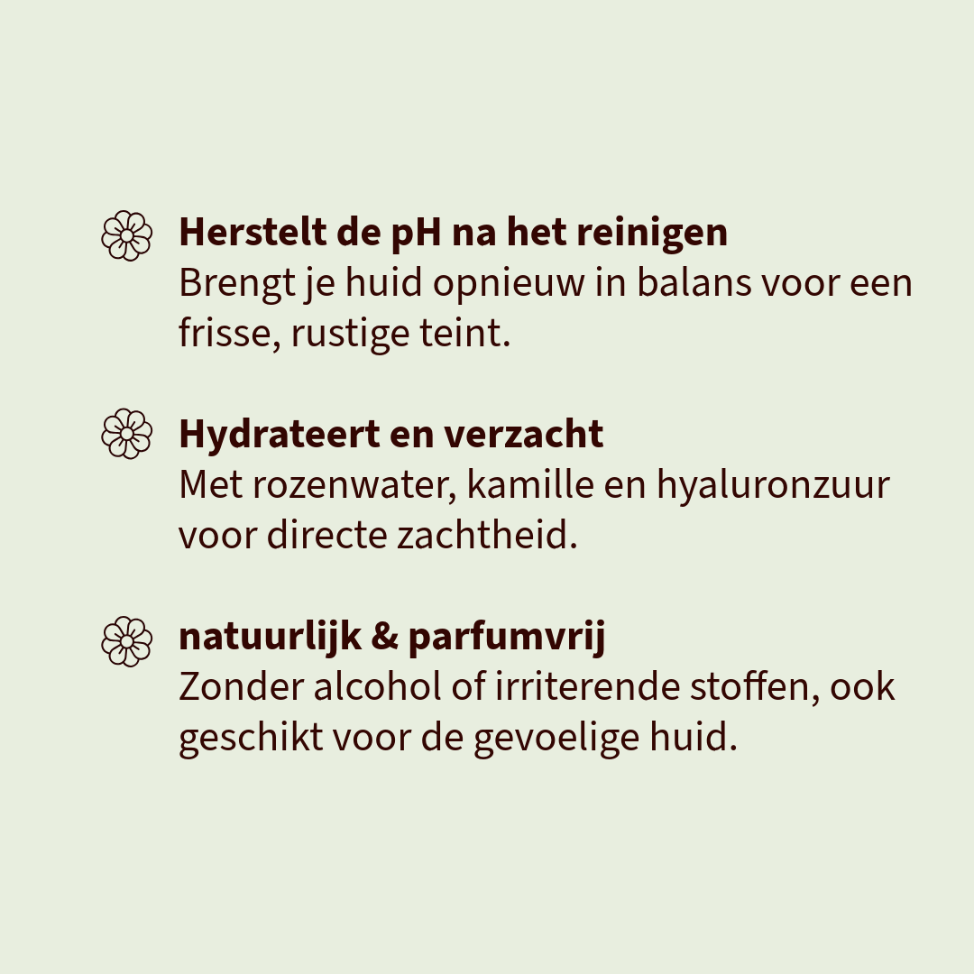 Deze natuurlijke formule verfrist direct na het reinigen, herstelt de pH-waarde en maakt je huid soepel en ontvankelijk voor de volgende verzorgingsstappen.