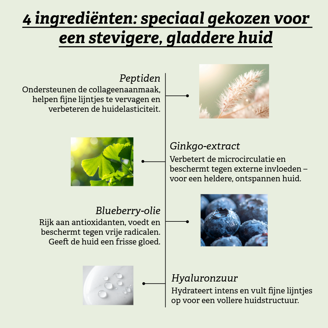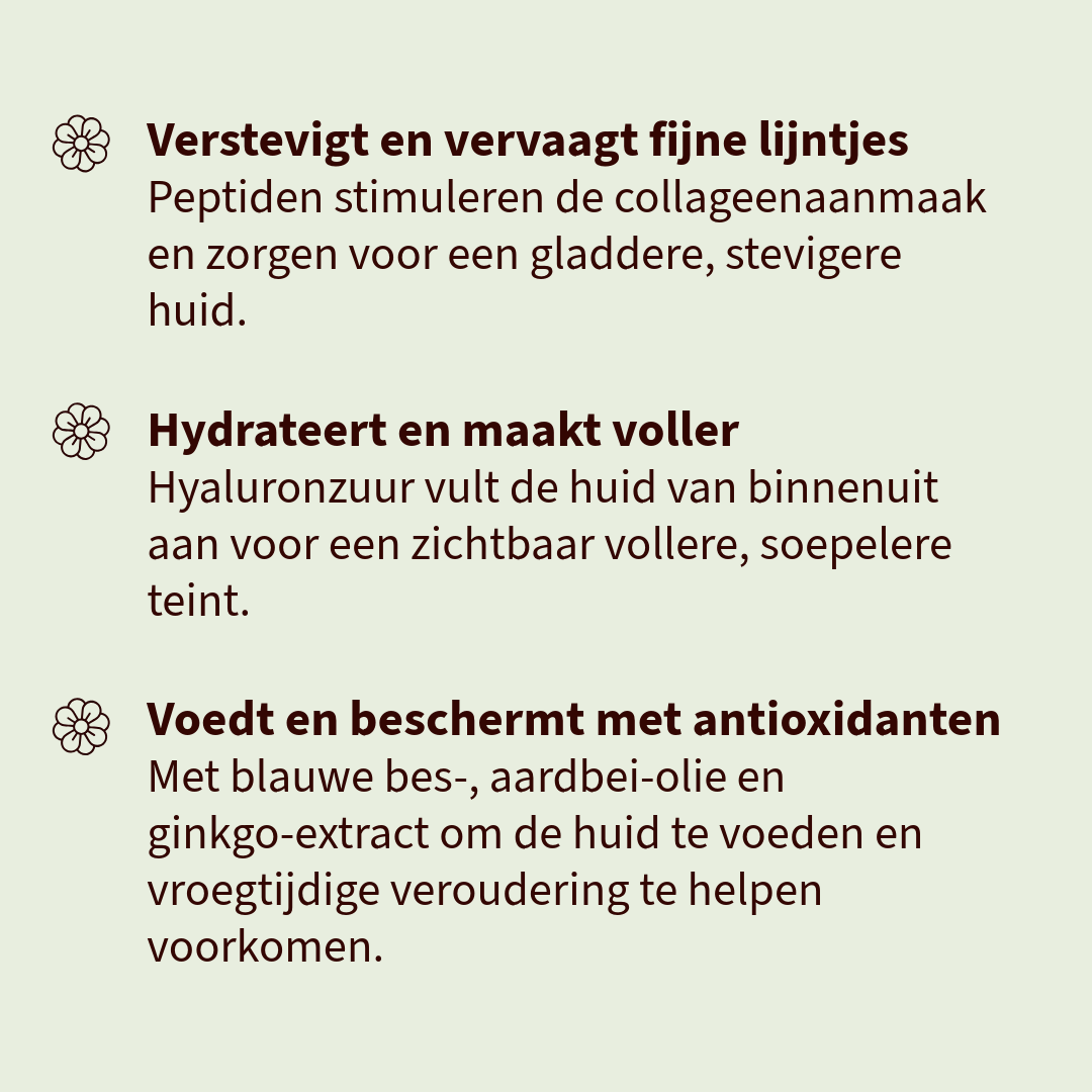 ✓ Verbetert stevigheid en elasticiteit dankzij doelgerichte peptiden ✓ Vermindert fijne lijntjes en maakt de huid zichtbaar gladder ✓ Hydrateert diep en geeft een satijnzacht resultaat ✓ Voedt met antioxidanten en kalmeert de huid ✓ 99 % natuurlijk, 20 % biologisch & vegan